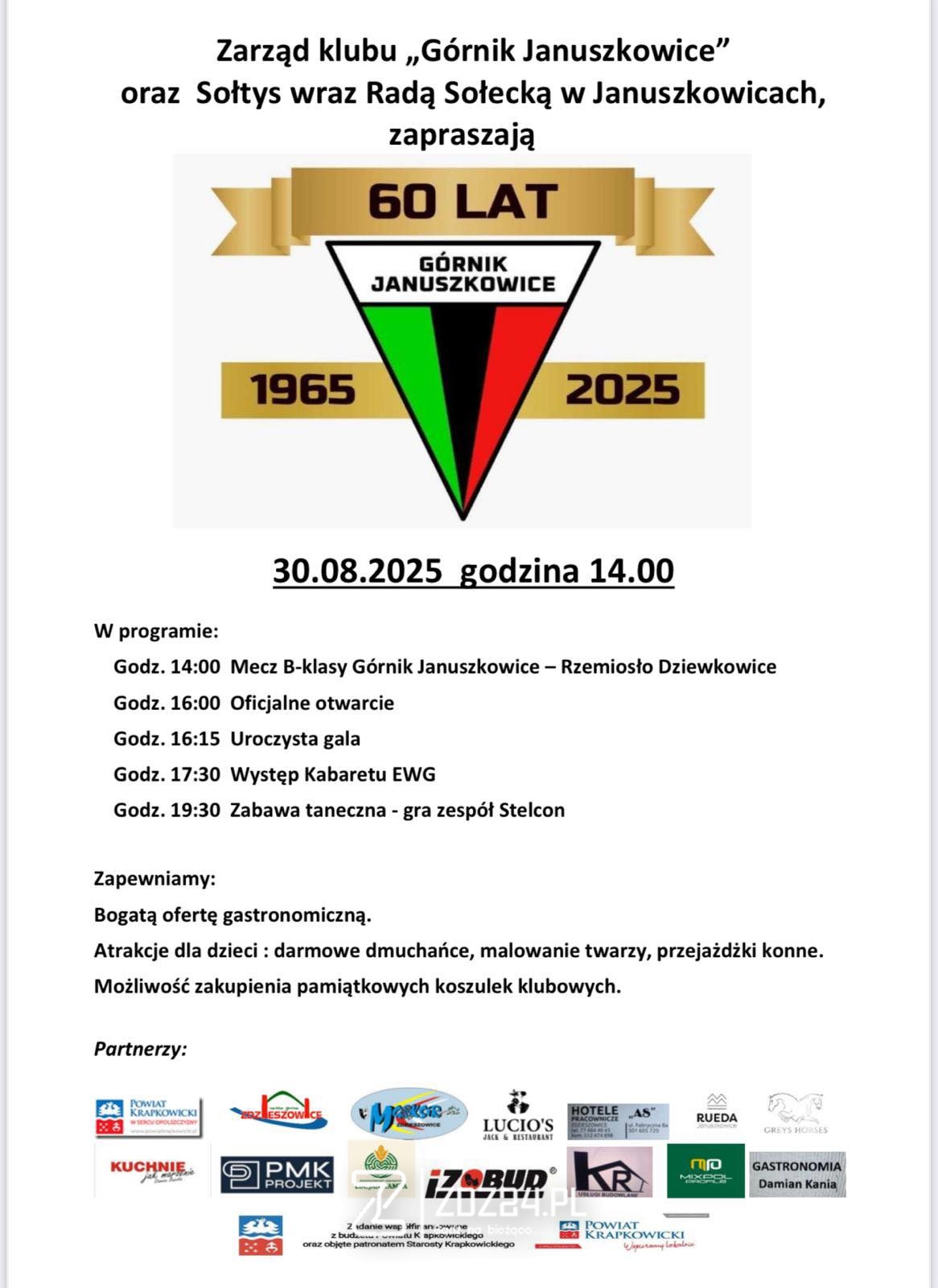 W najbliższą sobotę, 30 sierpnia 2025 roku, na stadionie w Januszkowicach odbędą się uroczyste obchody 60-lecia klubu Górnik Januszkowice. Wydarzenie rozpocznie się o godzinie 14:00 i potrwa do późnego wieczora.