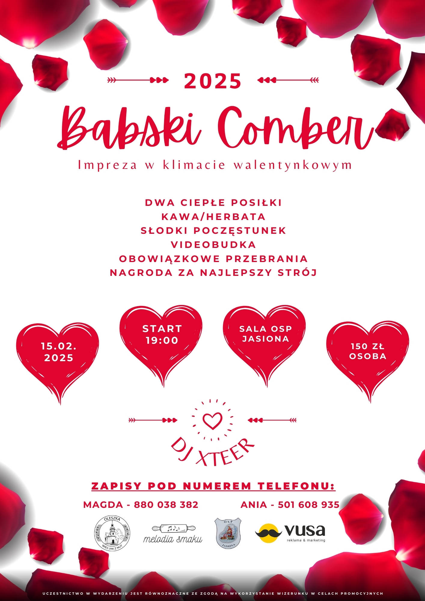 Już 15 lutego 2025 roku w Sali OSP Jasiona odbędzie się wyjątkowe wydarzenie – Babski Comber. Impreza zapowiada się w klimacie walentynkowym i jest pełna atrakcji dla uczestniczek.