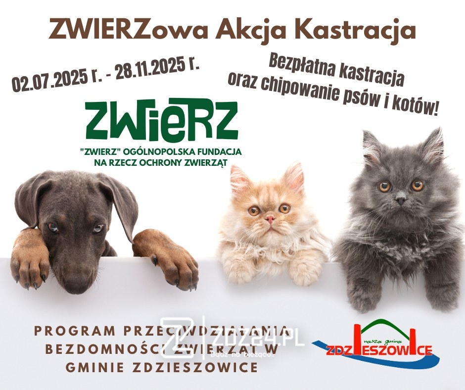 W dniach od 2 lipca do 28 listopada 2025 roku w Gminie Zdzieszowice realizowane będzie zadanie pn. „ZWIERZowa Akcja Kastracja”, organizowane we współpracy z Ogólnopolską Fundacją na Rzecz Ochrony Zwierząt „ZWIERZ”.