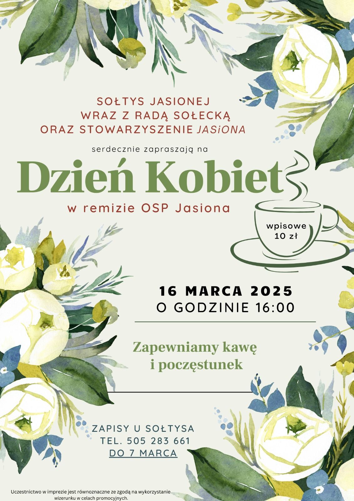 Sołtys Jasiony, Rada Sołecka oraz Stowarzyszenie JasiOna zapraszają wszystkie panie na obchody Dnia Kobiet, które odbędą się 16 marca 2025 roku o godzinie 16:00 w remizie OSP Jasiona.