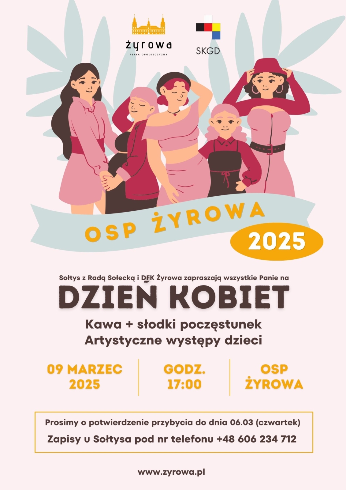 Sołtys, Rada Sołecka oraz DFK Żyrowa zapraszają wszystkie Panie na uroczyste spotkanie z okazji Dnia Kobiet, które odbędzie się 9 marca 2025 r. o godzinie 17:00 w OSP Żyrowa.