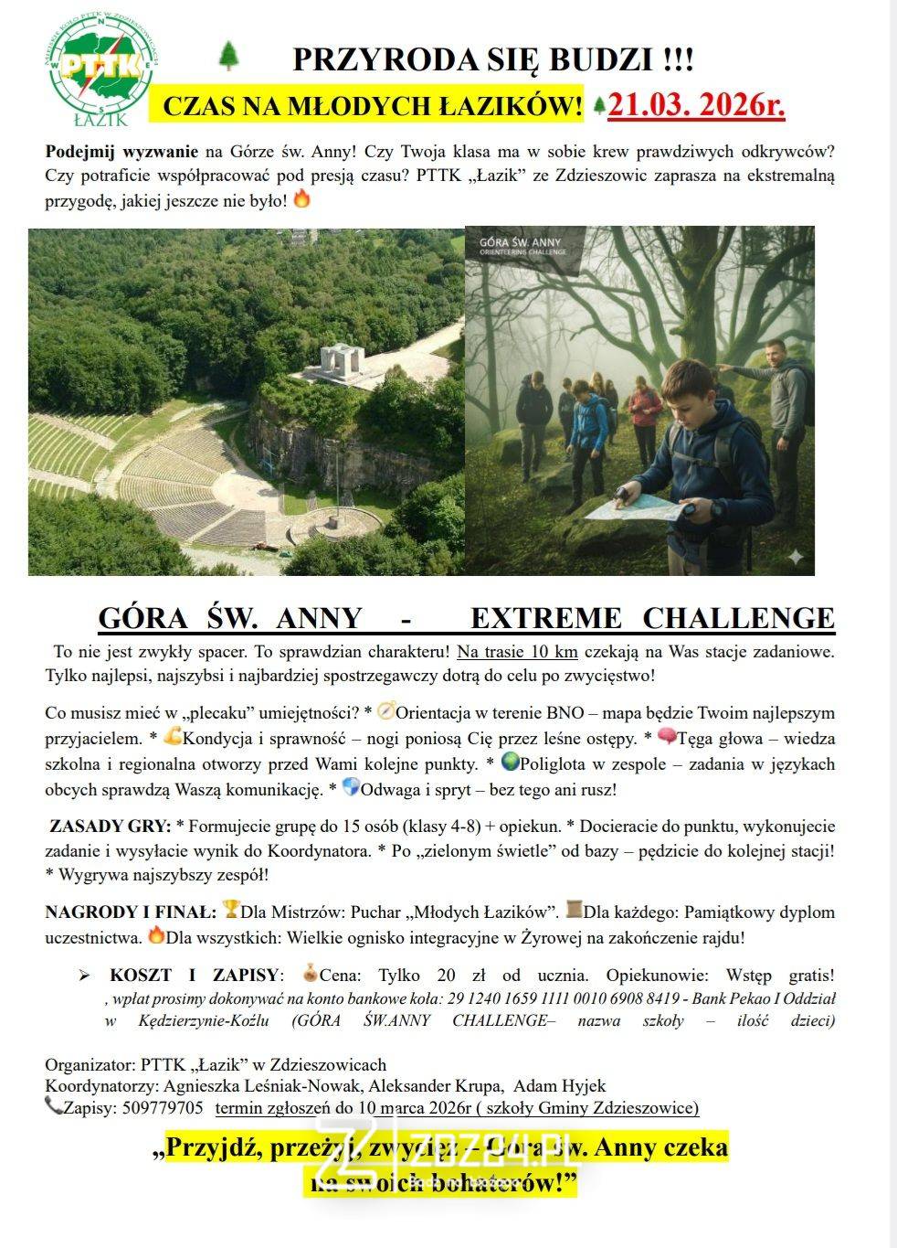 Miejskie Koło PTTK „Łazik” w Zdzieszowicach zaprasza uczniów klas 4–8 z gminy Zdzieszowice do udziału w terenowej grze przygodowej „Góra Św. Anny – Extreme Challenge”.