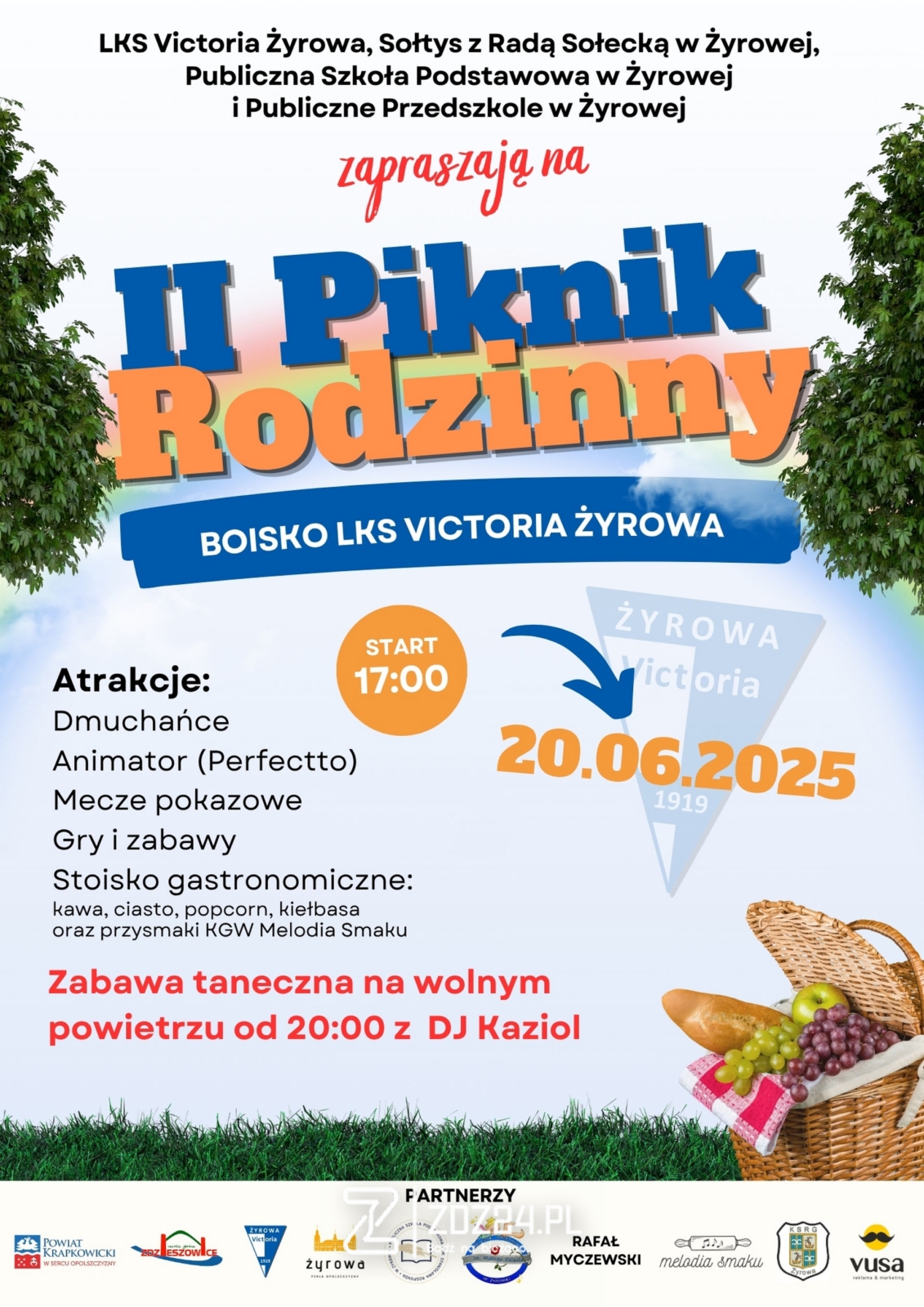 Już dzisiaj 17 czerwca 2025 r. o godzinie 17:00 na boisku LKS Victoria Żyrowa odbędzie się II Piknik Rodzinny. Wydarzenie organizowane jest przez LKS Victoria Żyrowa, Sołtysa i Radę Sołecką Żyrowej, Publiczną Szkołę Podstawową oraz Publiczne Przedszkole w Żyrowej.