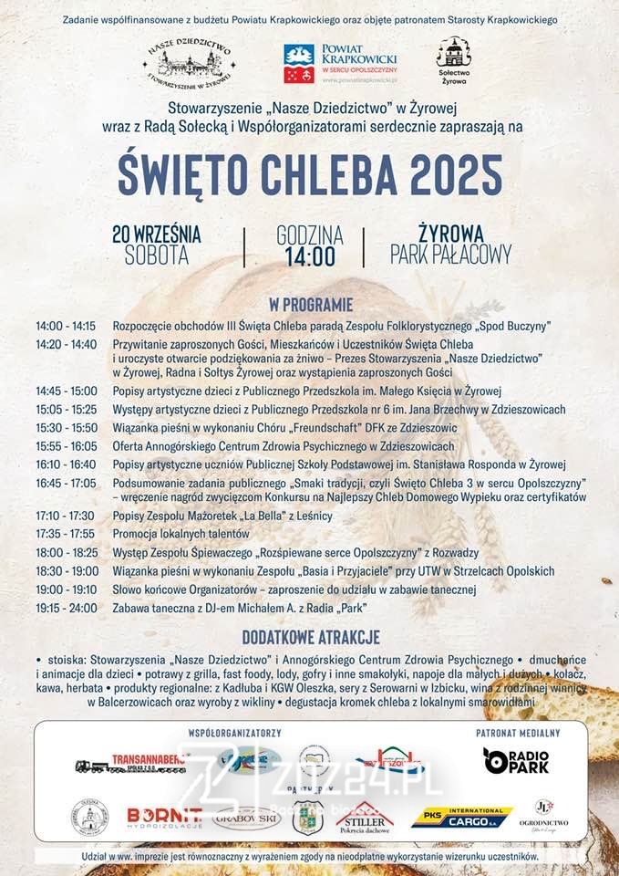 20 września 2025 roku o godzinie 14:00 w parku przypałacowym w Żyrowej przy ul. Korfantego 5 odbędzie się trzecia edycja Święta Chleba.