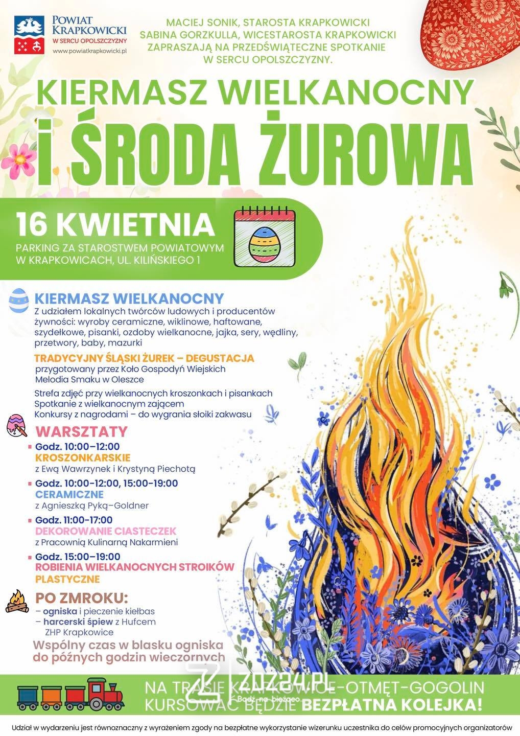 W środę 16 kwietnia 2025 roku parking za Starostwem Powiatowym w Krapkowicach zamieni się w tętniące życiem świąteczne miasteczko. Organizatorzy zapraszają mieszkańców na Kiermasz Wielkanocny połączony z obchodami tradycyjnej Środy Żurowej.