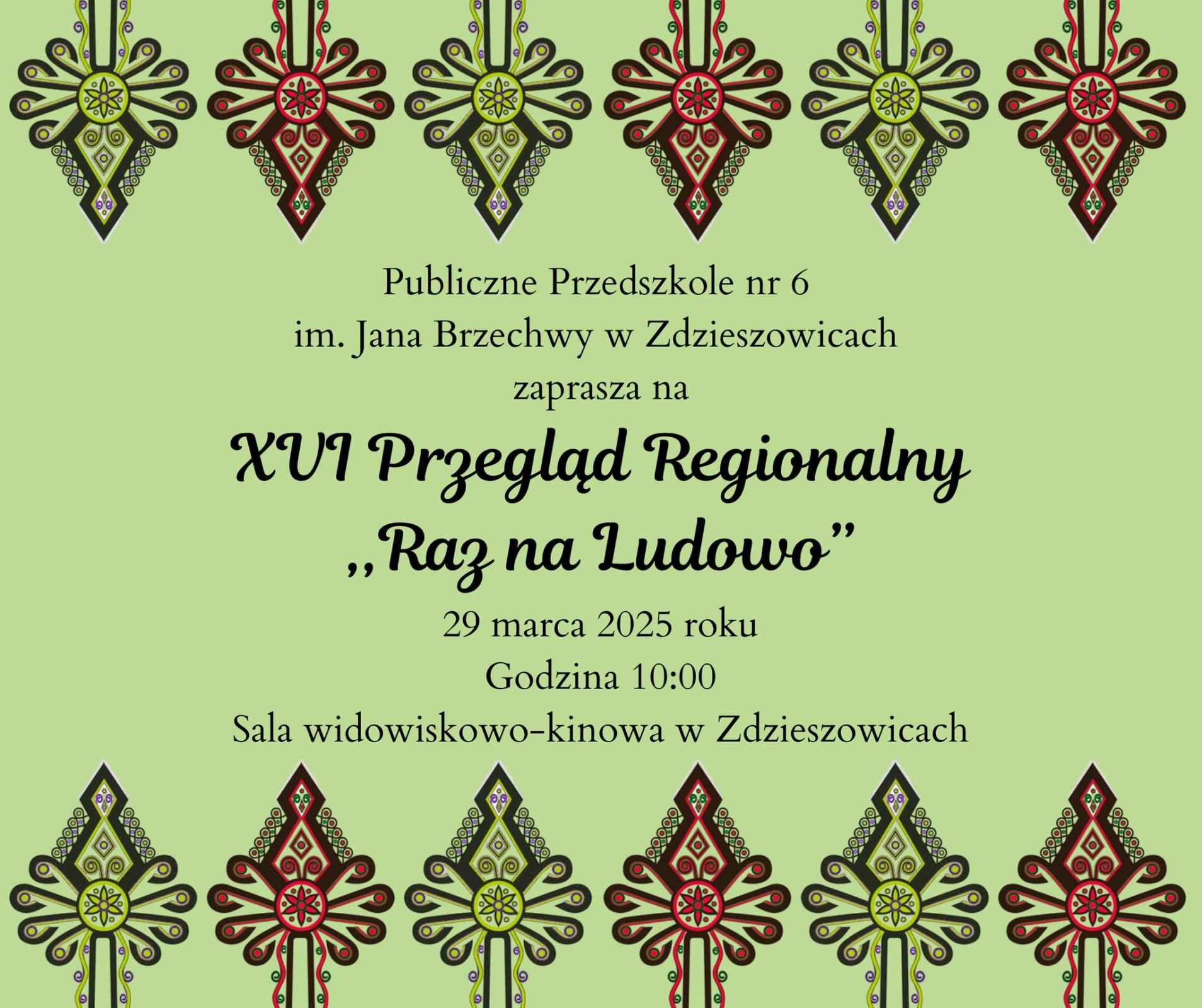 Publiczne Przedszkole nr 6 im. Jana Brzechwy w Zdzieszowicach zaprasza na XVI edycję Przeglądu Regionalnego „Raz na Ludowo”. Wydarzenie odbędzie się 29 marca 2025 roku (sobota) o godzinie 10:00 w sali widowiskowo-kinowej przy ul. Powstańców Śląskich 7 w Zdzieszowicach.