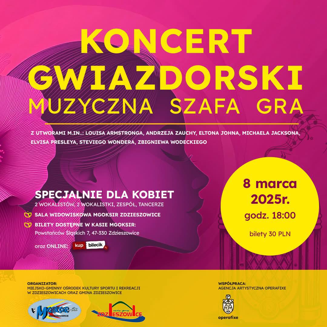 8 marca 2025 roku, z okazji Dnia Kobiet, w Sali Widowiskowej M-GOKSiR w Zdzieszowicach odbędzie się Koncert Gwiazdorski – Muzyczna Szafa Gra. Wydarzenie to będzie wyjątkową okazją do wysłuchania największych przebojów muzyki rozrywkowej w wykonaniu wokalistów, zespołu oraz tancerzy.