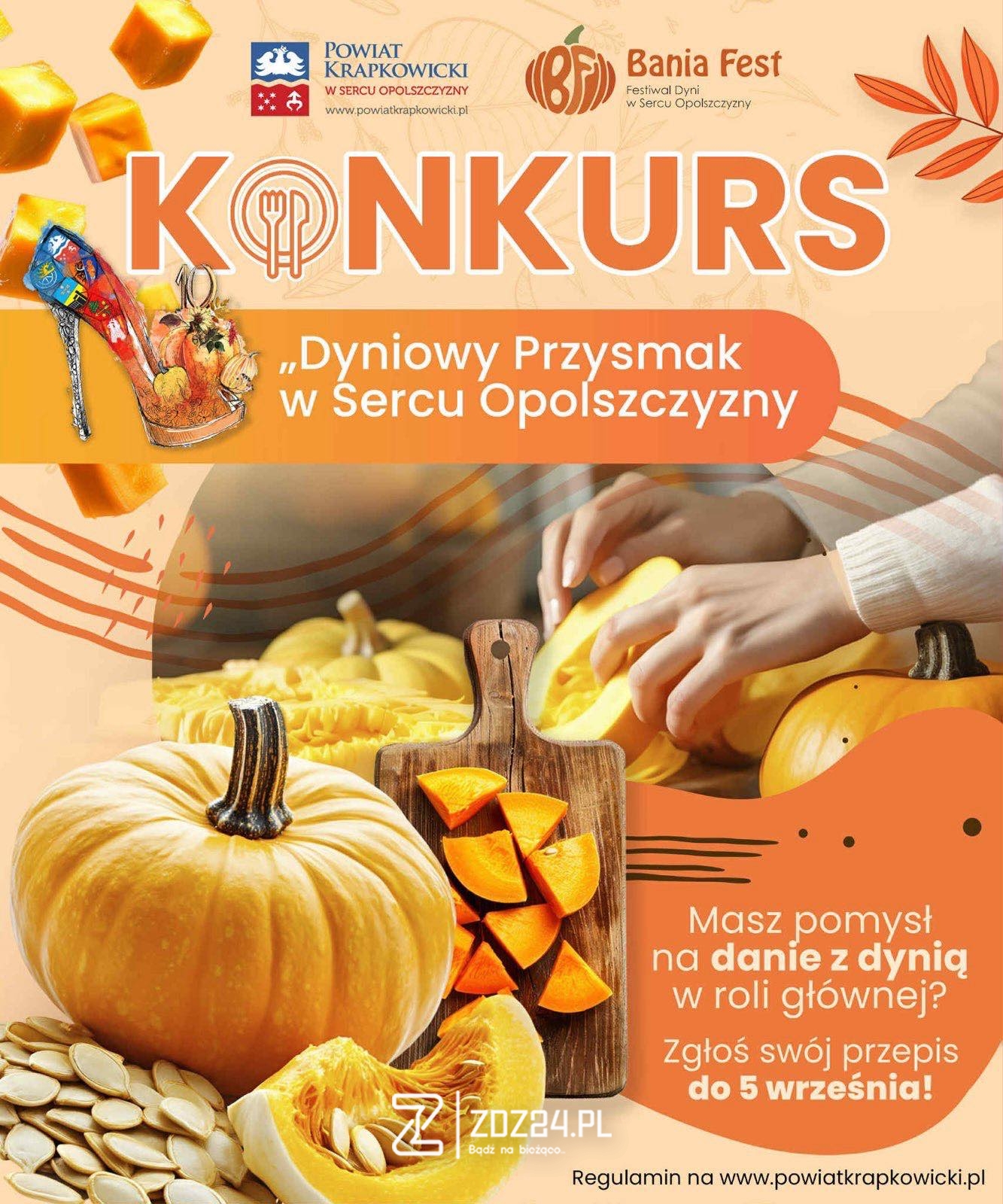Powiat Krapkowicki zaprasza mieszkańców do udziału w konkursie kulinarnym „Dyniowy Przysmak w sercu Opolszczyzny”, organizowanym w ramach nadchodzącego Bania Fest.