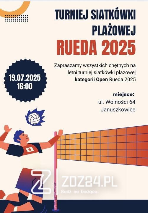 W sobotę 19 lipca 2025 r. o godzinie 16:00 na terenie obiektu Rueda przy ul. Wolności 64 w Januszkowicach odbędzie się turniej siatkówki plażowej kategorii Open – RUEDA 2025.
