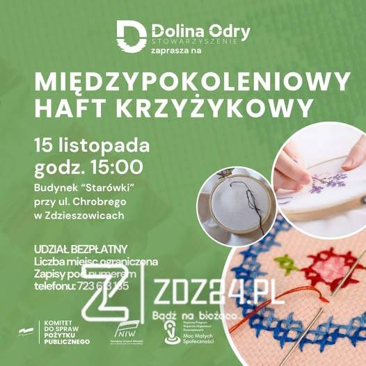 15 listopada o godzinie 15:00 w budynku „Starówki” przy ulicy Chrobrego w Zdzieszowicach odbędą się międzypokoleniowe warsztaty haftu krzyżykowego organizowane przez Stowarzyszenie Dolina Odry. Wydarzenie skierowane jest do mieszkańców w każdym wieku, zarówno osób początkujących, jak i tych, które miały już kontakt z rękodziełem.