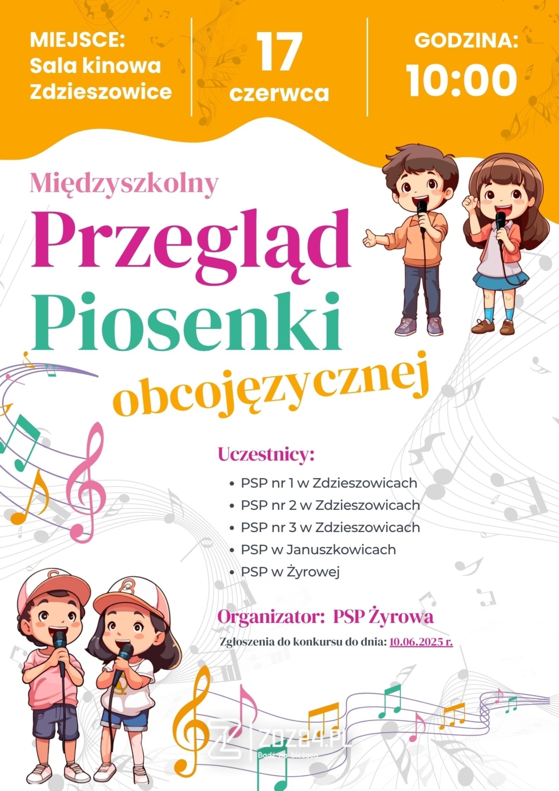 17 czerwca 2025 r. o godz. 10:00 w Sali MGOKSiR w Zdzieszowicach odbędzie się Międzyszkolny Przegląd Piosenki Obcojęzycznej. W wydarzeniu wezmą udział uczniowie z pięciu szkół podstawowych gminy Zdzieszowice.