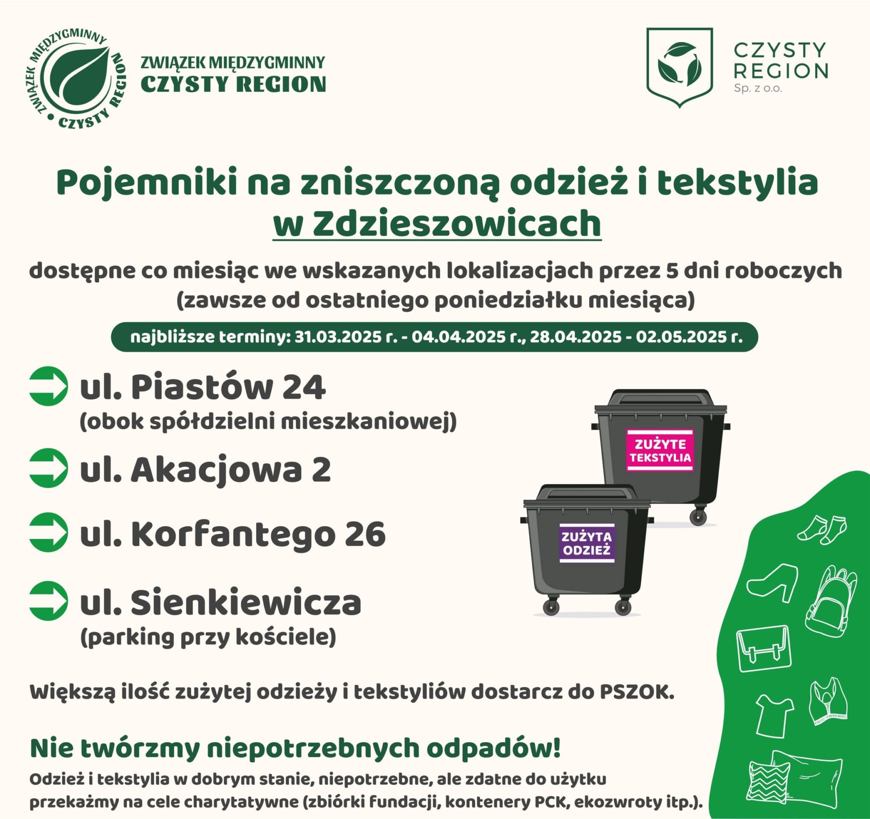 Od 31 marca 2025 roku mieszkańcy Zdzieszowic będą mogli korzystać z nowych pojemników przeznaczonych na zużytą odzież oraz tekstylia. Inicjatywa ma ułatwić mieszkańcom miasta pozbycie się niepotrzebnych ubrań w sposób ekologiczny i odpowiedzialny.
