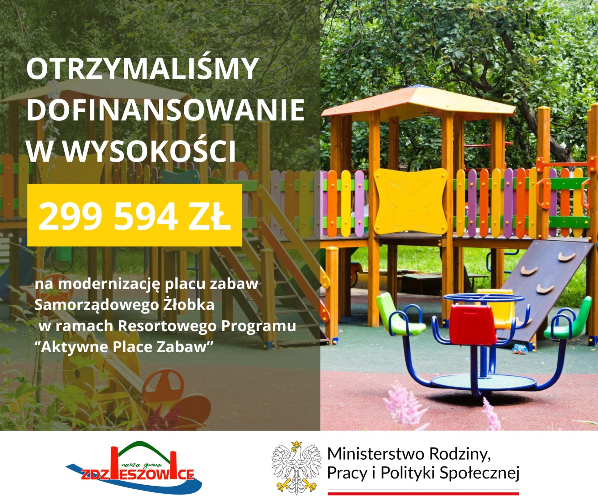 Dobra wiadomość dla najmłodszych mieszkańców gminy! Żłobek Samorządowy w naszym mieście otrzymał dofinansowanie w wysokości 299 594 zł na modernizację placu zabaw. Środki zostały przyznane w ramach Resortowego Programu Aktywne Place Zabaw 2025, organizowanego przez Ministerstwo Rodziny, Pracy i Polityki Społecznej.