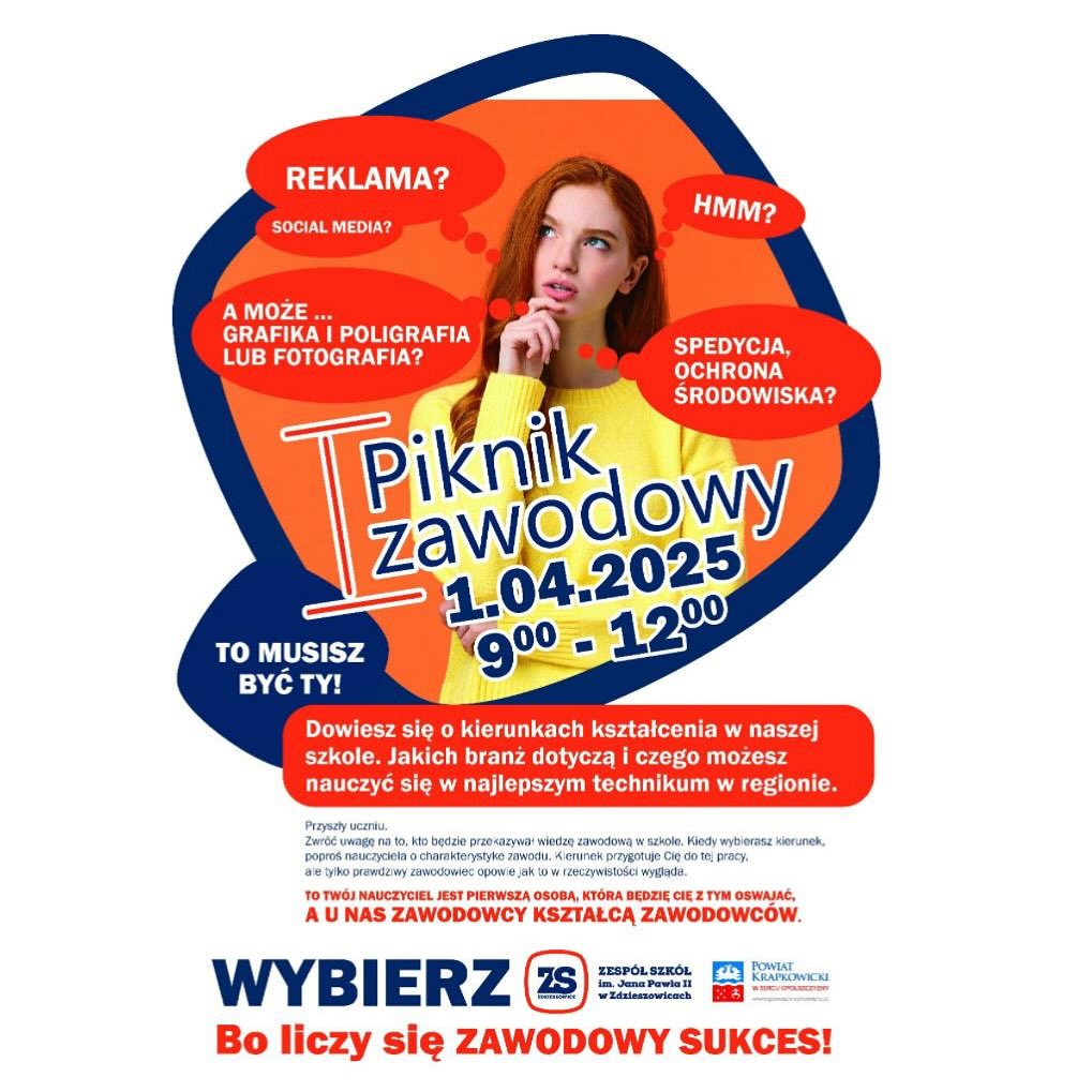 1 kwietnia 2025 roku w godzinach od 9:00 do 12:00, w Zespole Szkół im. Jana Pawła II w Zdzieszowicach, odbędzie się Piknik Zawodowy. Wydarzenie jest doskonałą okazją do poznania szerokiej oferty edukacyjnej placówki, w tym takich kierunków jak grafika i poligrafia, fotografia, reklama oraz specjalizacje związane ze spedycją i ochroną środowiska. Uczestnicy będą mieli możliwość zapoznania się ze specyfiką zawodów, porozmawiania z nauczycielami praktykami oraz uzyskania wskazówek na temat przyszłej kariery zawodowej. Piknik Zawodowy jest otwarty dla wszystkich zainteresowanych, którzy stoją przed wyborem dalszej ścieżki edukacyjnej i chcą świadomie podjąć decyzję o swojej przyszłości zawodowej.