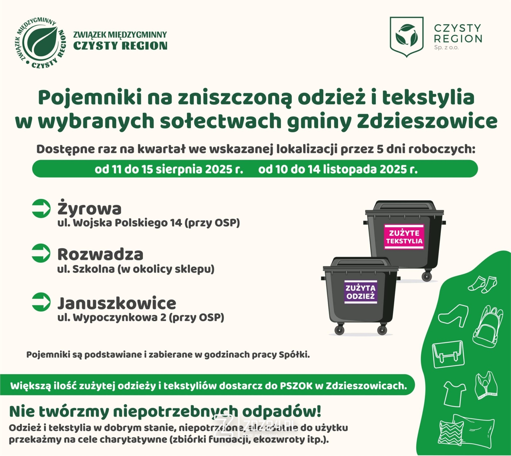 Związek Międzygminny „Czysty Region” poinformował o kolejnej edycji kwartalnej zbiórki zniszczonej odzieży i tekstyliów. Pojemniki będą dostępne w trzech sołectwach gminy Zdzieszowice przez 5 dni roboczych – od 11 do 15 sierpnia 2025 r.