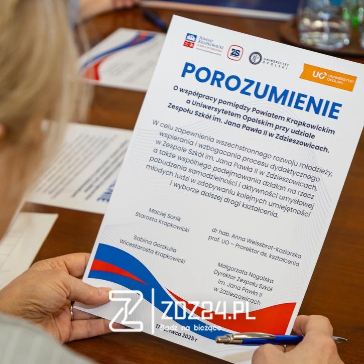 Zespół Szkół im. Jana Pawła II w Zdzieszowicach podpisał porozumienie o współpracy z Uniwersytetem Opolskim. W wydarzeniu uczestniczyli Starosta Krapkowicki Maciej Sonik, dyrektor szkoły Małgorzata Nogalska oraz przedstawiciele uczelni, w tym dr hab. Anna Weissbrot-Koziarska, prof. UO, Prorektor ds. kształcenia.