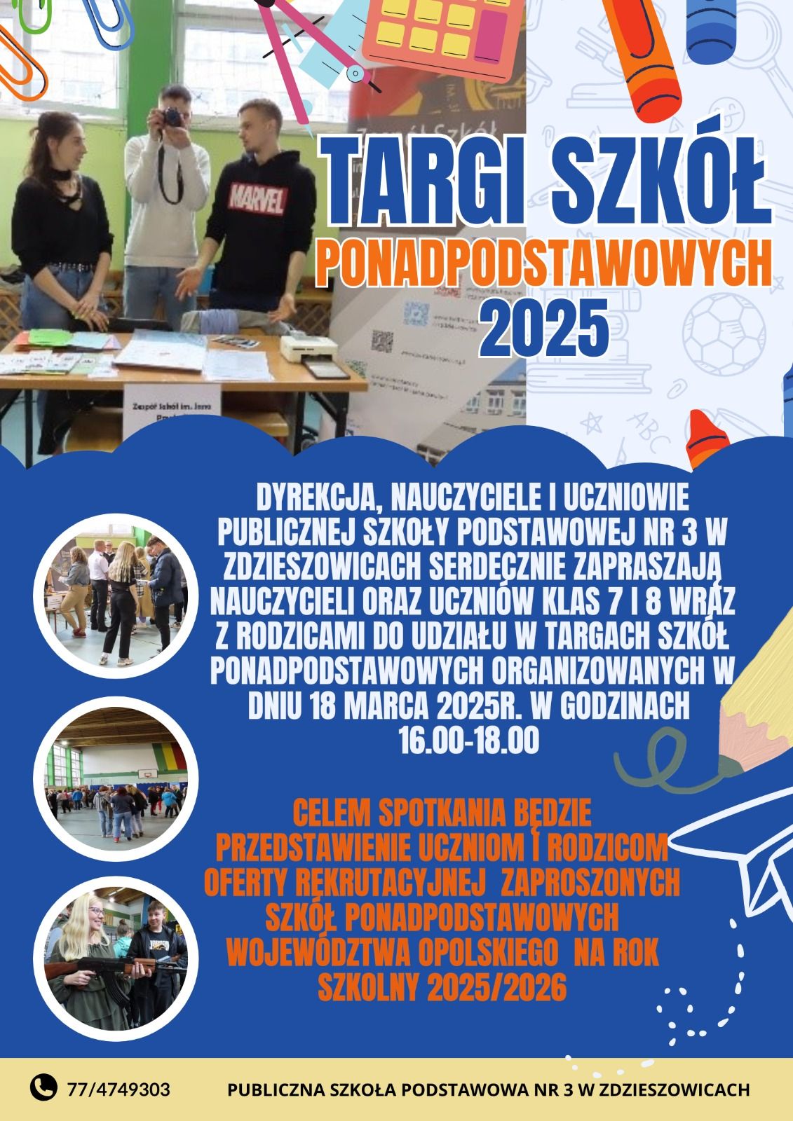 Publiczna Szkoła Podstawowa nr 3 w Zdzieszowicach organizuje Targi Szkół Ponadpodstawowych, które odbędą się 18 marca 2025 r. w godzinach 16:00-18:00. Wydarzenie adresowane jest do uczniów klas 7 i 8, ich rodziców oraz nauczycieli.