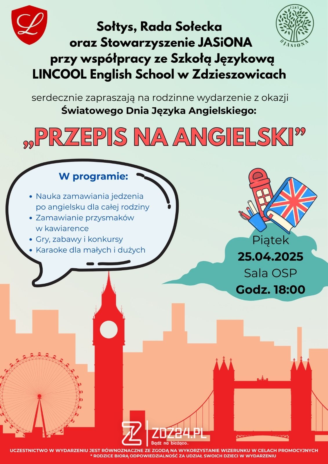 Z okazji Światowego Dnia Języka Angielskiego w Jasionie odbędzie się wyjątkowe wydarzenie rodzinne pn. „Przepis na angielski”. Spotkanie zaplanowano na piątek, 25 kwietnia 2025 roku o godzinie 18:00 w sali OSP.