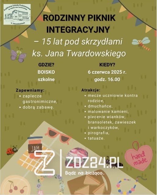 W piątek, 6 czerwca 2025 r., na szkolnym boisku Publicznej Szkoły Podstawowej im. ks. Jana Twardowskiego w Januszkowicach odbędzie się Rodzinny Piknik Integracyjny. Wydarzenie organizowane z okazji 15-lecia szkoły pod patronatem ks. Jana Twardowskiego rozpocznie się o godz. 16:00.