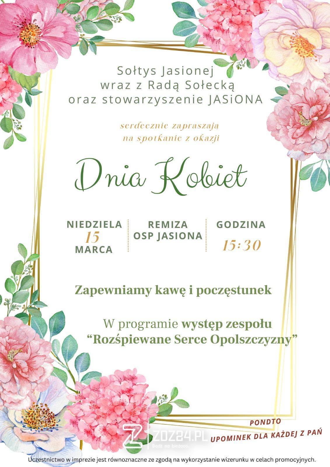 W Jasionej odbędzie się spotkanie z okazji Dnia Kobiet, na które zaproszone są wszystkie mieszkanki miejscowości oraz okolic. Wydarzenie zaplanowano na niedzielę 15 marca 2026 roku o godzinie 15:30 w remizie OSP Jasiona.