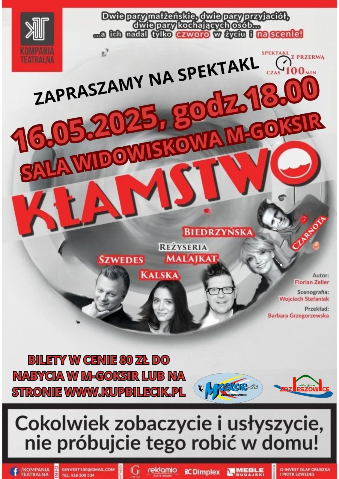 16 maja 2025 r. o godz. 18:00 w Sali Widowiskowej M-GOKSiR w Zdzieszowicach odbędzie się spektakl „Kłamstwo” – komedia autorstwa Floriana Zellera w reżyserii Wojciecha Malajkata. Na scenie wystąpią znani aktorzy: Szwedes, Biedrzyńska, Kalska i Czarnota. Spektakl trwa 100 minut i zawiera przerwę.