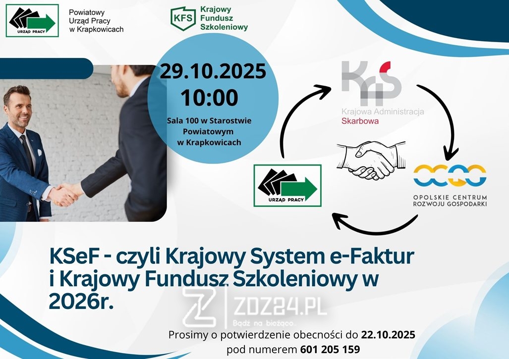 Powiatowy Urząd Pracy w Krapkowicach zaprasza przedsiębiorców oraz pracodawców na spotkanie informacyjne poświęcone nowym przepisom dotyczącym Krajowego Systemu e-Faktur (KSeF) oraz zmianom w Krajowym Funduszu Szkoleniowym, które wejdą w życie od 2026 roku.