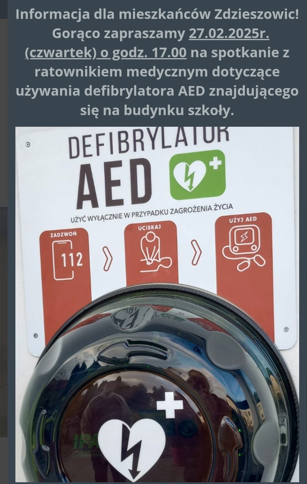 27 lutego 2025 r. w szkole odbyło się spotkanie z ratownikiem medycznym, podczas którego omówiono działanie defibrylatora AED znajdującego się na budynku szkoły oraz przypomniano zasady udzielania pierwszej pomocy przedmedycznej.