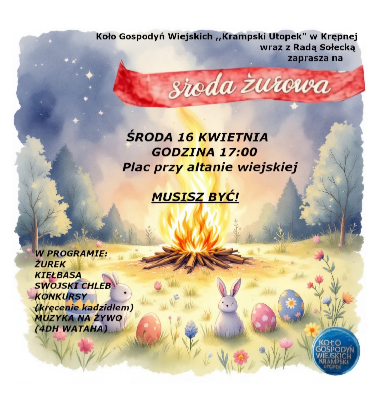 W środę 16 kwietnia 2025 roku o godzinie 17:00 na placu przy altanie wiejskiej w Krępnej odbędzie się tradycyjna Środa Żurowa. Organizatorami wydarzenia są nowo powstałe Koło Gospodyń Wiejskich „Krampski Utopek” oraz Rada Sołecka.