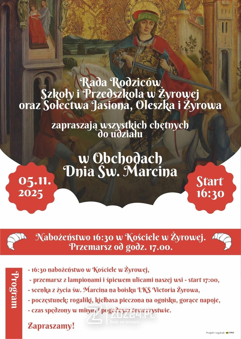 Wydarzenie rozpocznie się nabożeństwem o godz. 16:30 w kościele parafialnym, po którym mieszkańcy wyruszą w barwnym pochodzie z lampionami i śpiewem. Następnie na boisku LKS Victoria Żyrowa zaprezentowana zostanie scenka z życia św. Marcina, a wieczór zakończy wspólne spotkanie przy ognisku z poczęstunkiem — tradycyjnymi rogalikami, kiełbasą i gorącymi napojami.