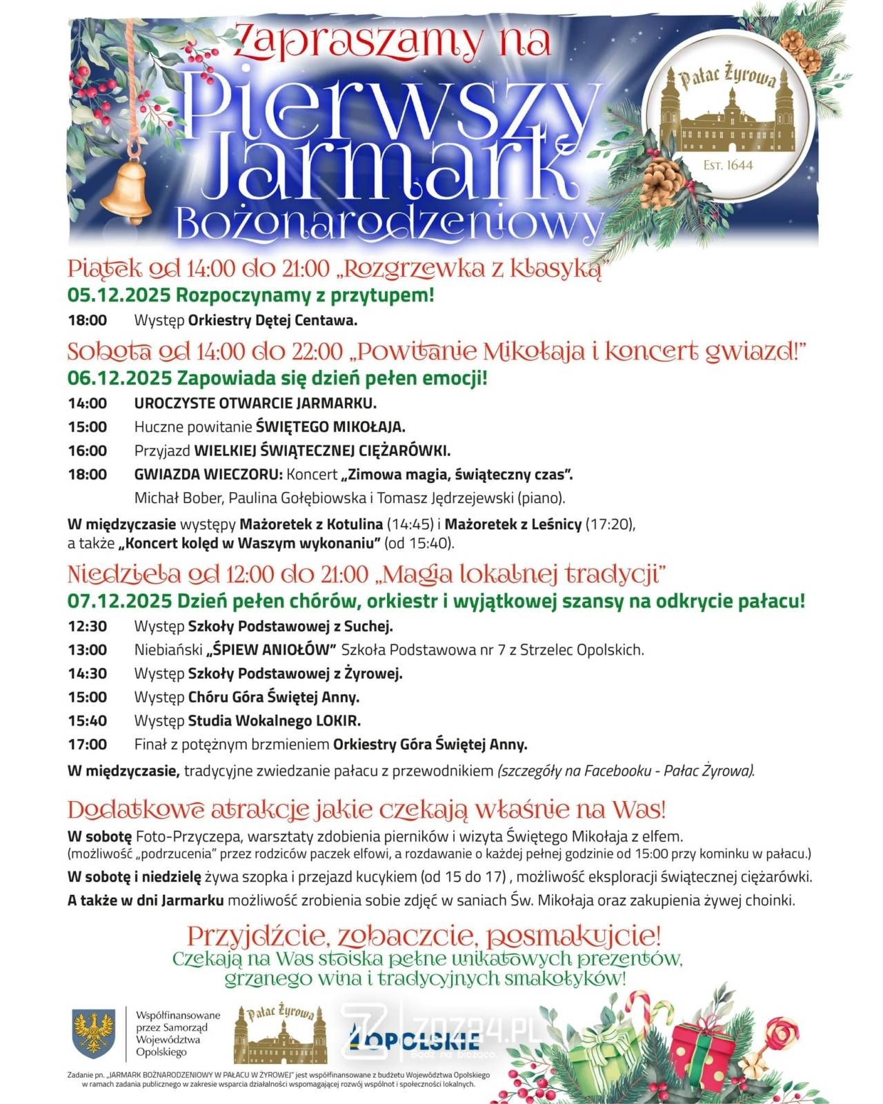 W dniach 5–7 grudnia 2025 roku w Pałacu w Żyrowej odbędzie się Pierwszy Jarmark Bożonarodzeniowy, organizowany z rozmachem i bogatym programem dla całych rodzin.