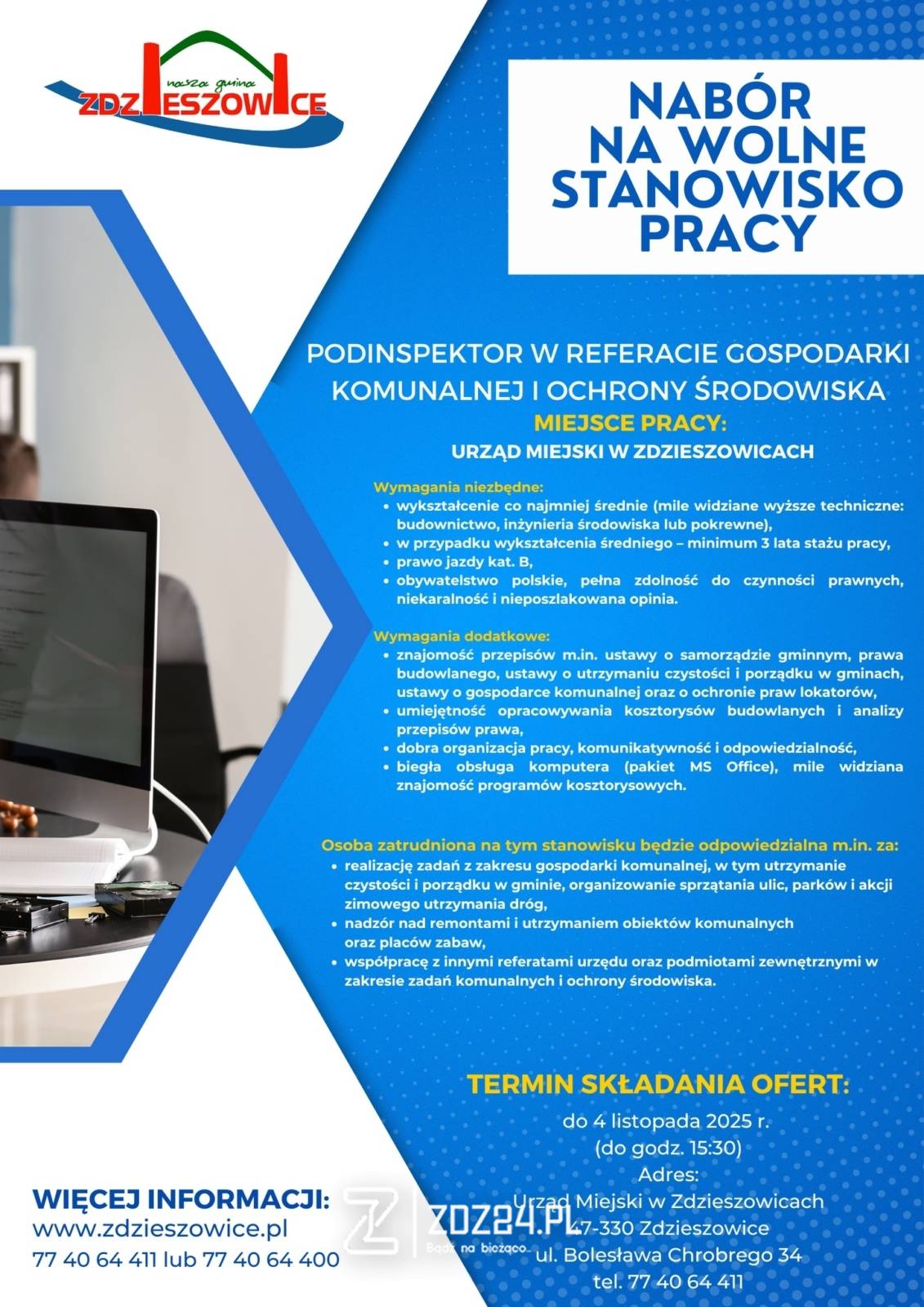 Burmistrz Zdzieszowic ogłosił nabór na wolne stanowisko urzędnicze w Referacie Gospodarki Komunalnej i Ochrony Środowiska. Poszukiwany jest podinspektor, który zajmie się realizacją zadań związanych z utrzymaniem czystości i porządku w gminie, nadzorem nad remontami obiektów komunalnych oraz współpracą z jednostkami zewnętrznymi.