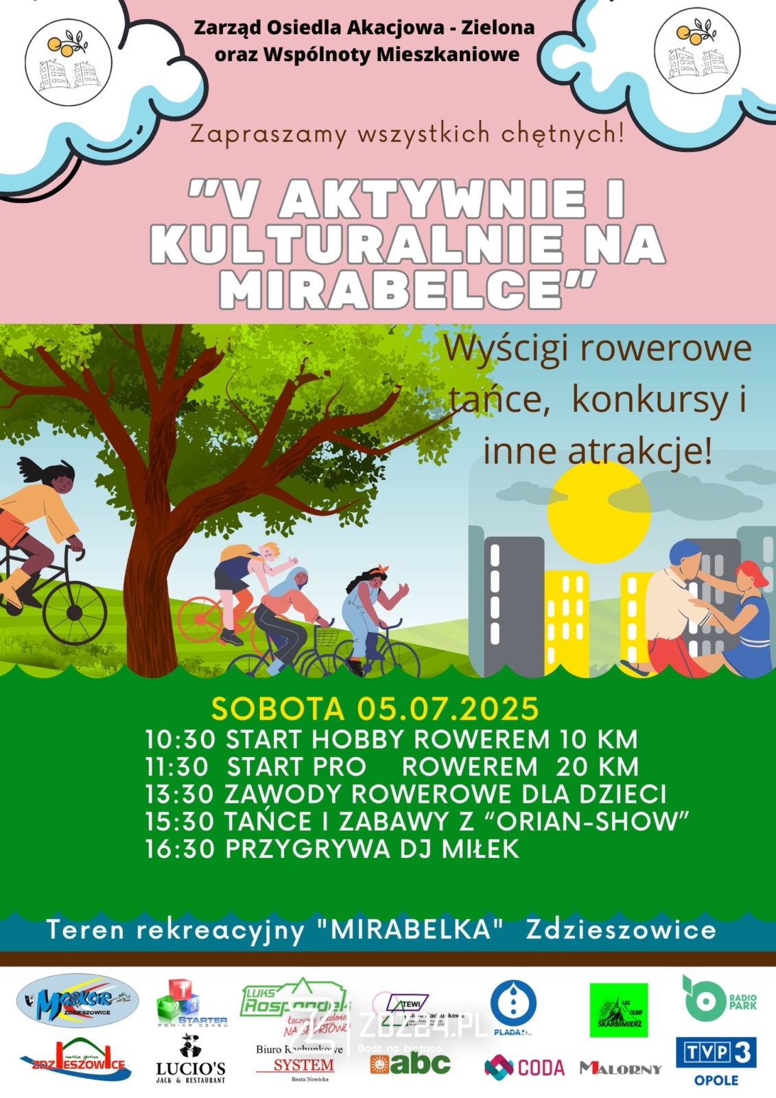 Zarząd Osiedla Akacjowa–Zielona we współpracy ze wspólnotami mieszkaniowymi zaprasza na piątą edycję wydarzenia „Aktywnie i kulturalnie na Mirabelce”, które odbędzie się 5 lipca 2025 r. na terenie rekreacyjnym „Mirabelka” w Zdzieszowicach.