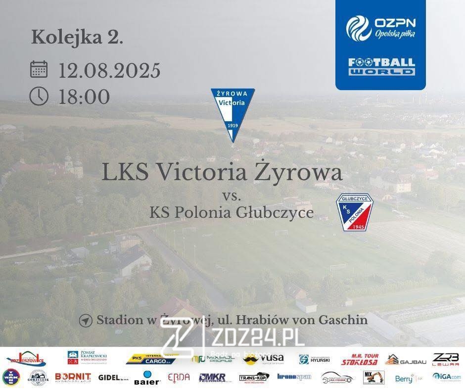 We wtorek, 12 sierpnia 2025 roku, na stadionie w Żyrowej odbędzie się spotkanie 2. kolejki Klasy Okręgowej grupy opolskiej. Gospodarze – LKS Victoria Żyrowa – zmierzą się z drużyną KS Polonia Głubczyce.