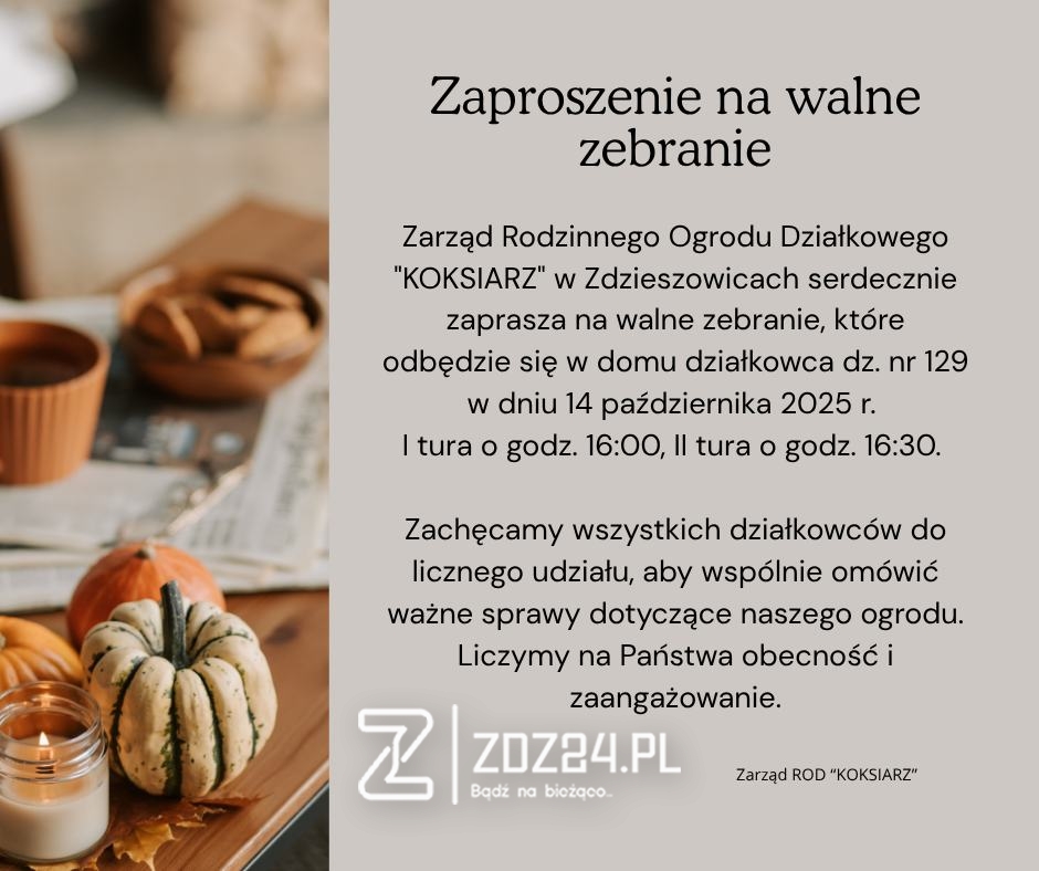 Zarząd Rodzinnego Ogrodu Działkowego „KOKSIARZ” w Zdzieszowicach zaprasza wszystkich działkowców na walne zebranie, które odbędzie się 14 października 2025 roku w domu działkowca przy działce nr 129.