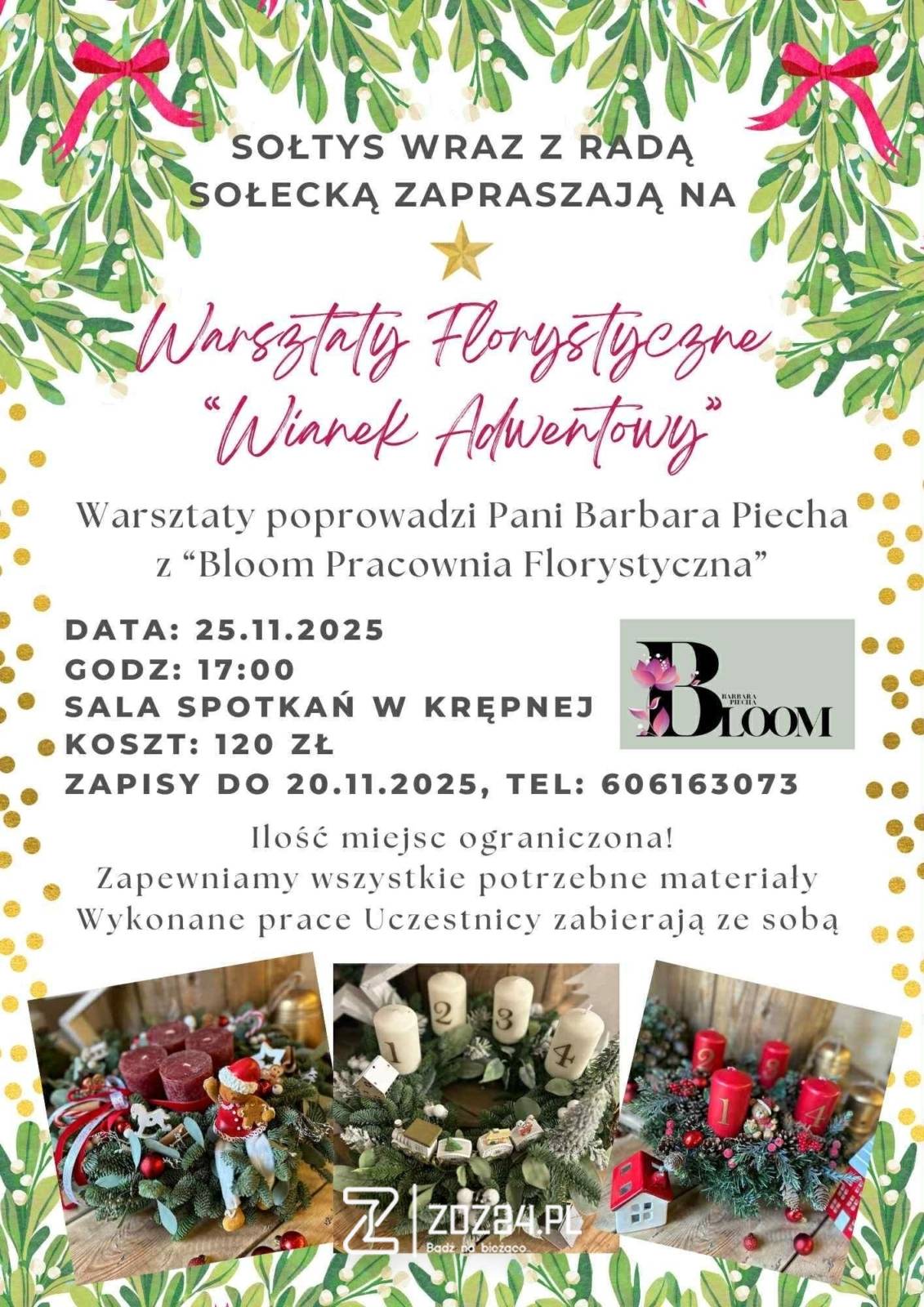 Spotkanie organizowane przez sołtysa i Radę Sołecką Krępnej poprowadzi Barbara PiechaBloom Pracownia Florystyczna. Podczas zajęć uczestnicy poznają tajniki tworzenia świątecznych kompozycji i własnoręcznie wykonają wianki adwentowe, które zabiorą ze sobą do domu.