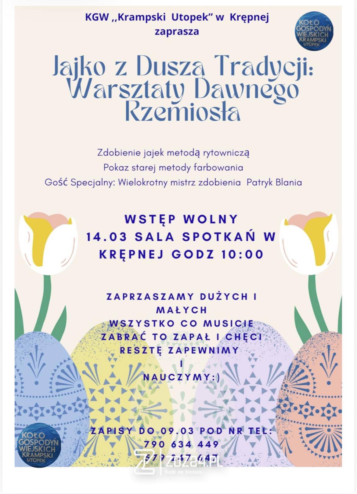 W Krępnej odbędą się warsztaty poświęcone tradycyjnej sztuce zdobienia wielkanocnych jaj. Wydarzenie pod nazwą „Jajko z duszą tradycji – warsztaty dawnego rzemiosła” zaplanowano na 14 marca 2026 roku o godzinie 10:00 w sali spotkań w Krępnej.