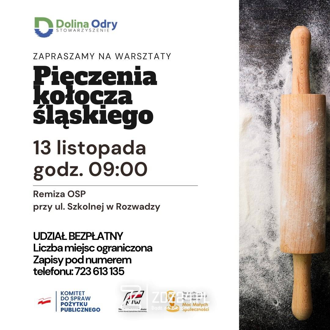 Już 13 listopada 2025 roku o godzinie 9:00 w Remizie OSP przy ul. Szkolnej w Rozwadzy odbędą się warsztaty kulinarne organizowane przez Stowarzyszenie Dolina Odry. Tematem spotkania będzie tradycyjny kołocz śląski – wypiek, który od pokoleń towarzyszy mieszkańcom regionu podczas ważnych uroczystości rodzinnych i świąt.