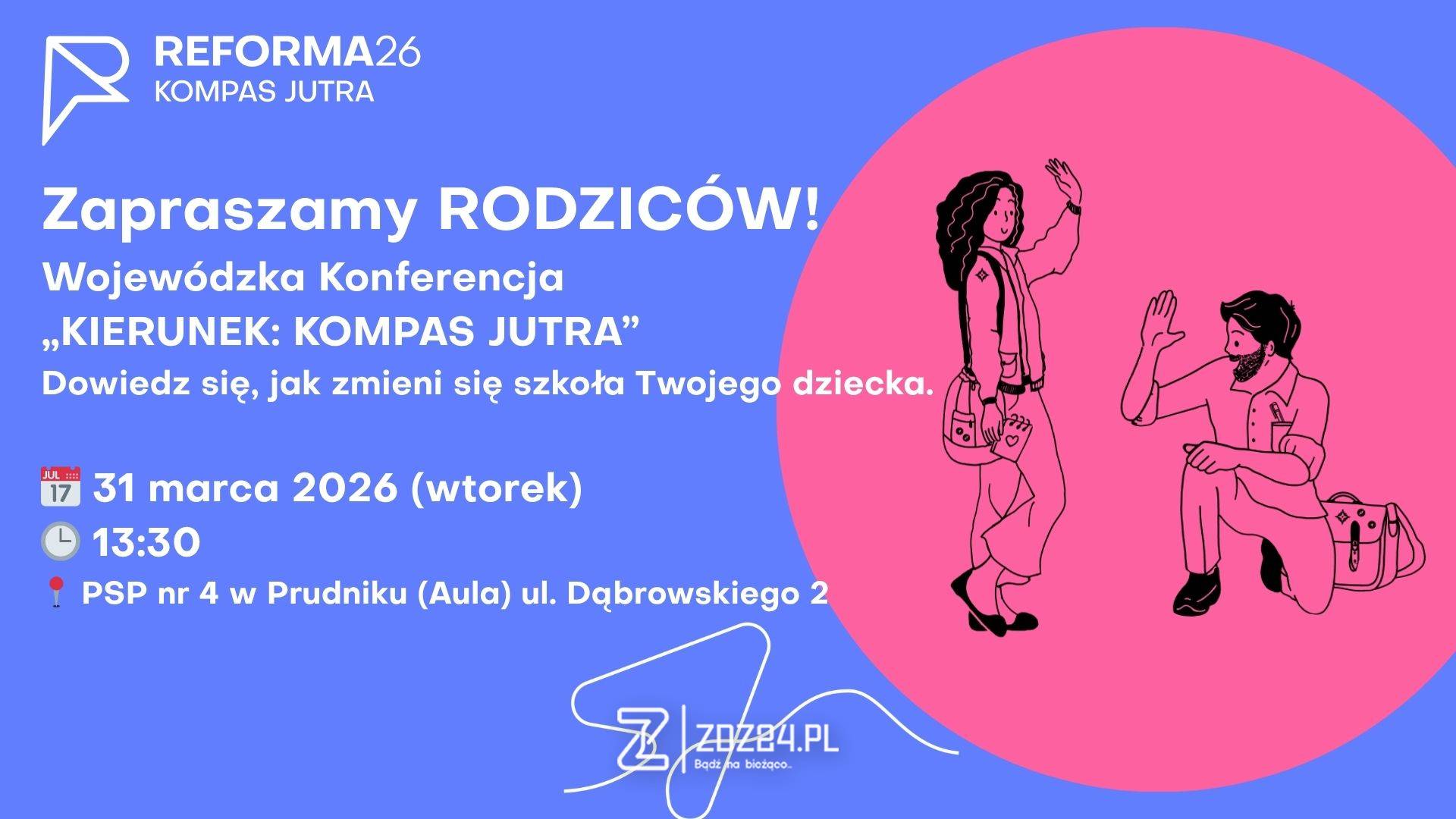 W Prudniku odbędzie się Wojewódzka Konferencja „KIERUNEK: KOMPAS JUTRA”, skierowana do rodziców, rad rodziców oraz przedstawicieli szkół. Wydarzenie ma dotyczyć planowanych zmian w edukacji w ramach Reformy26.