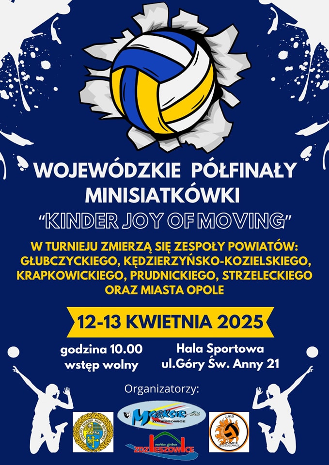 W dniach 12–13 kwietnia 2025 roku w Hali Sportowej przy ul. Góry Św. Anny 21 w Zdzieszowicach odbędą się wojewódzkie półfinały minisiatkówki w ramach ogólnopolskiego projektu „Kinder Joy of Moving”. Turniej zgromadzi najlepsze zespoły młodzieżowe z powiatów: Głubczyckiego, Kędzierzyńsko-Kozielskiego, Krapkowickiego, Prudnickiego, Strzeleckiego oraz miasta Opole.