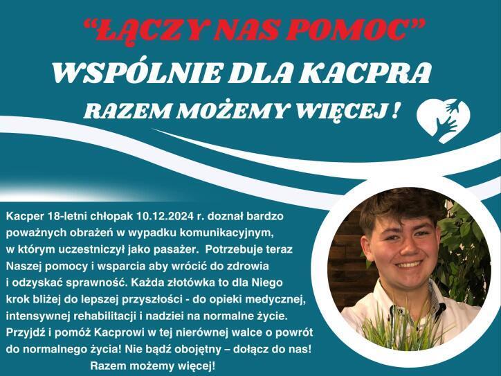 W dniach 21–22 lutego 2025 roku odbędzie się akcja charytatywna „Łączy nas pomoc – Wspólnie dla Kacpra”. Wydarzenie ma na celu wsparcie 18-letniego Kacpra, który doznał poważnych obrażeń w wypadku komunikacyjnym i potrzebuje pomocy w rehabilitacji oraz powrocie do zdrowia.