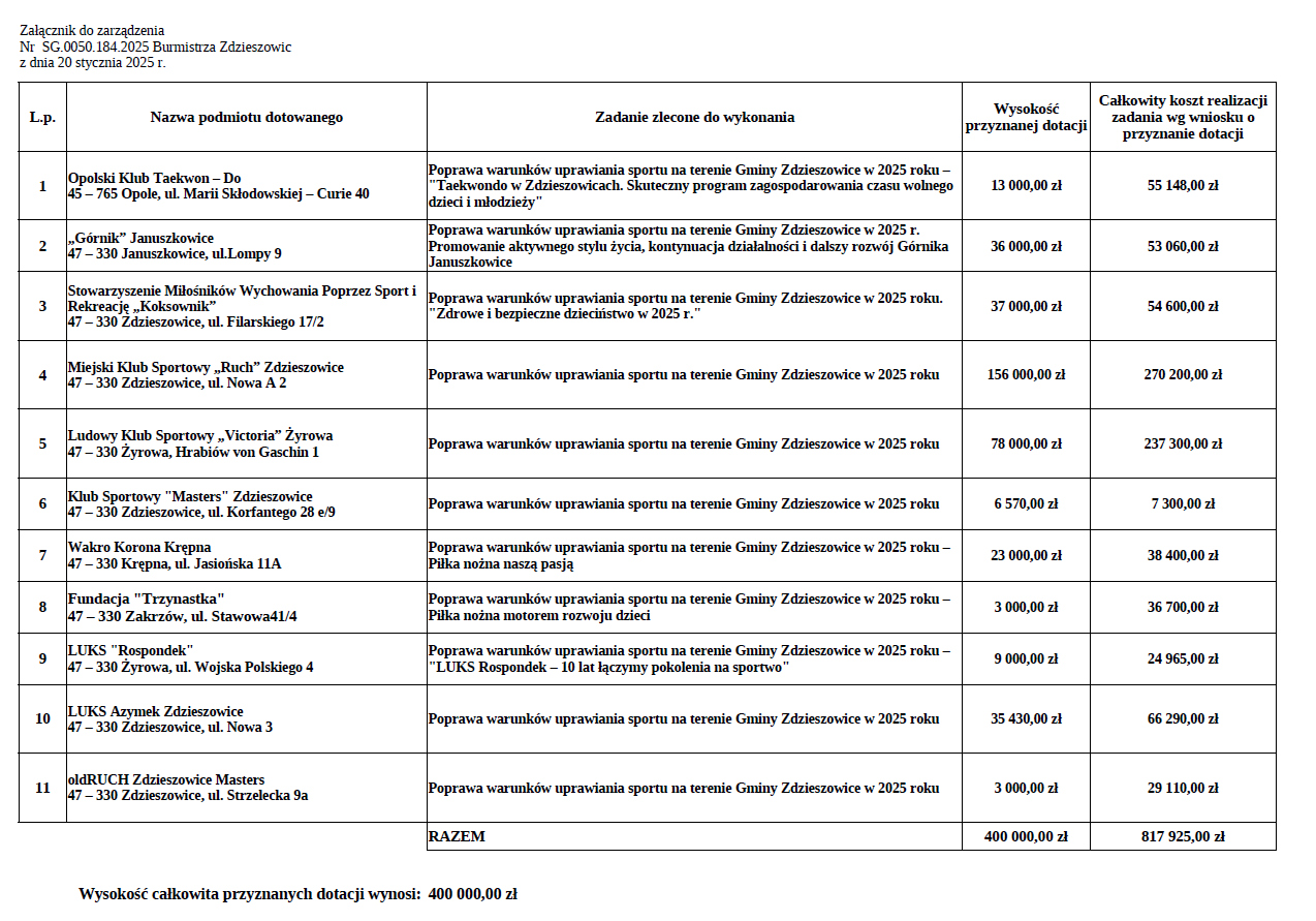 Burmistrz Zdzieszowic, zarządzeniem nr SG.0050.184.2025 z dnia 20 stycznia 2025 r., zatwierdził realizację zadań publicznych przez kluby sportowe, które wzięły udział w otwartym konkursie ogłoszonym 18 grudnia 2024 roku. W zarządzeniu określono także wysokość dotacji celowej na realizację projektów związanych z rozwojem sportu i aktywności fizycznej w gminie.