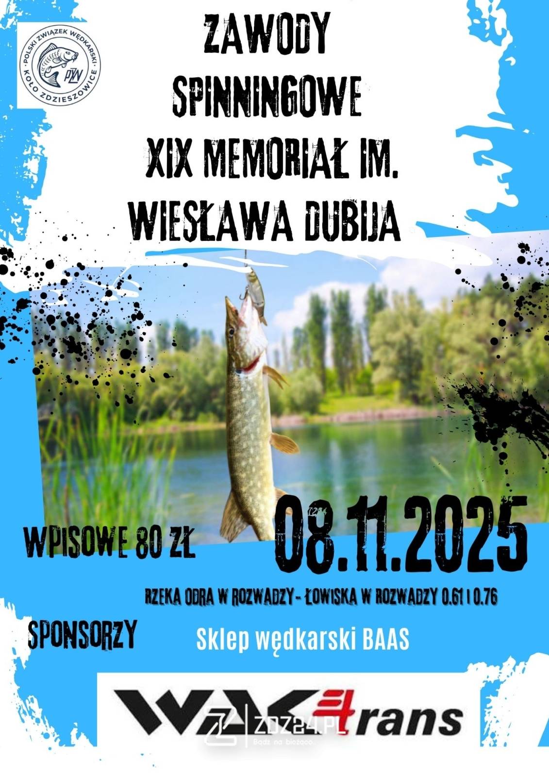 Zarząd Koła PZW Zdzieszowice zaprasza wędkarzy na kolejną edycję zawodów spinningowych – XIX Memoriał im. Wiesława Dubija, które odbędą się 8 listopada 2025 roku na rzece Odrze w Rozwadzy oraz łowiskach 0.61 i 0.76.