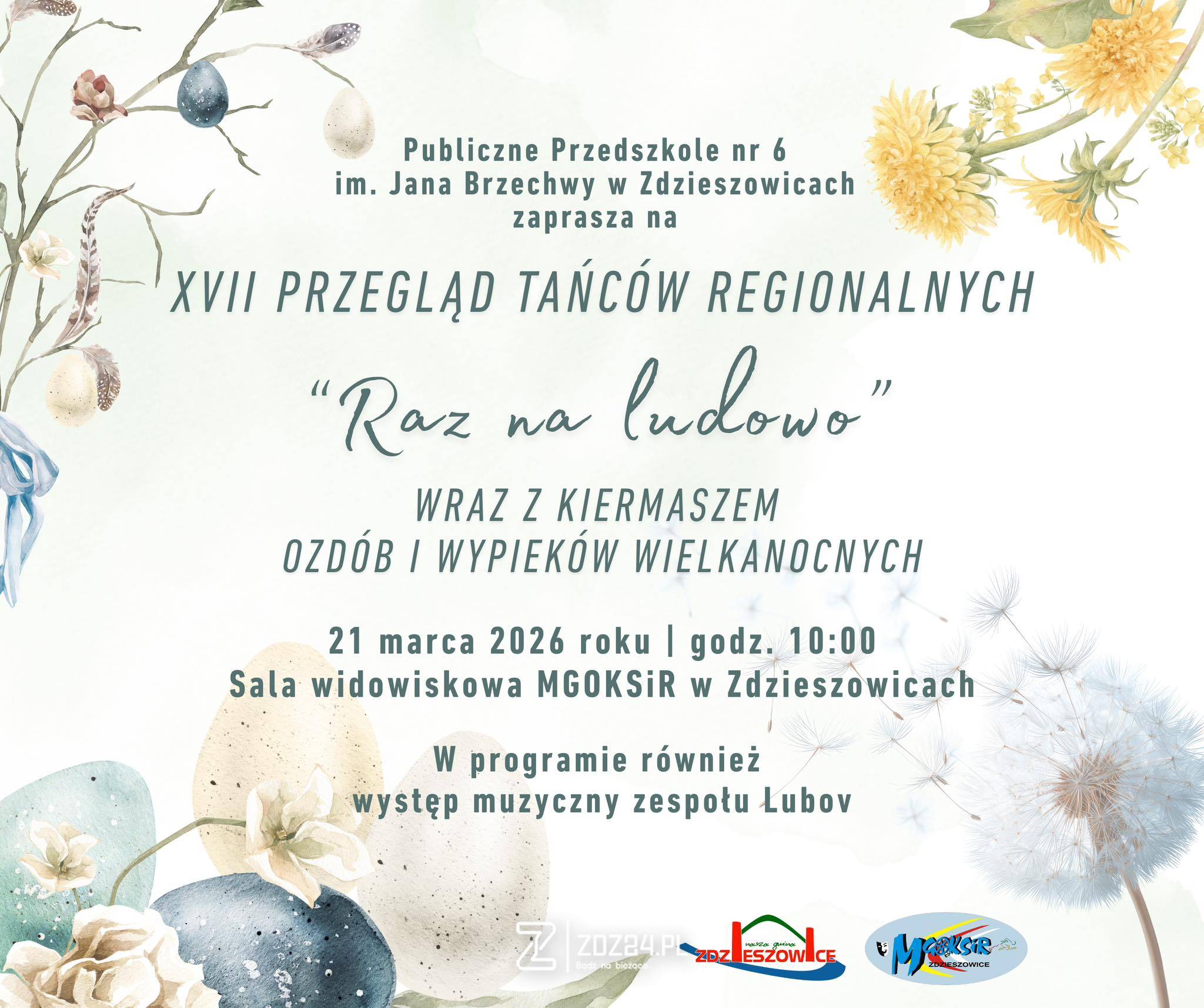21 marca 2026 roku o godzinie 10:00 w sali widowiskowej Miejsko-Gminnego Ośrodka Kultury Sportu i Rekreacji w Zdzieszowicach odbędzie się XVIII Przegląd Tańców Regionalnych „Raz na ludowo”. Wydarzenie połączone będzie z kiermaszem ozdób i wypieków wielkanocnych.