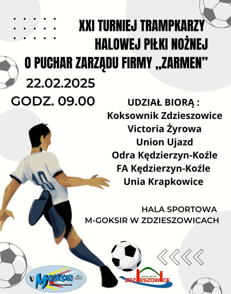 22 lutego 2025 roku w hali sportowej M-GOKSiR w Zdzieszowicach odbędzie się XXI Turniej Trampkarzy Halowej Piłki Nożnej. Wydarzenie będzie okazją do sportowej rywalizacji młodych zawodników, którzy zmierzą się w walce o Puchar Zarządu Firmy „Zarmen”.