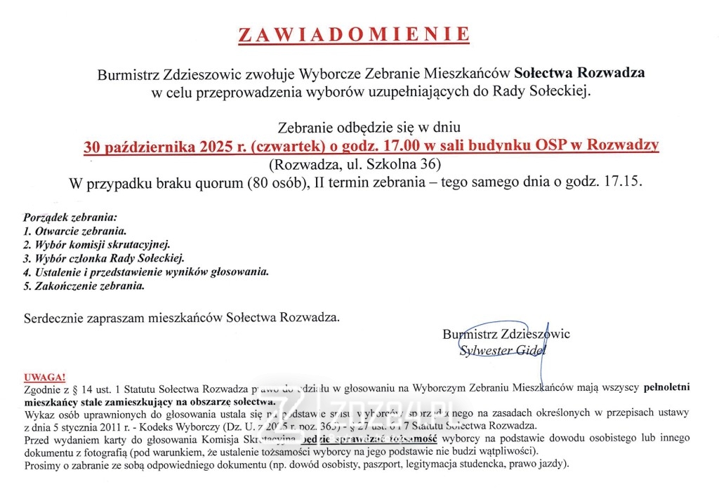 Burmistrz Zdzieszowic zwołał Wyborcze Zebranie Mieszkańców Sołectwa Rozwadza w celu przeprowadzenia wyborów uzupełniających do Rady Sołeckiej.