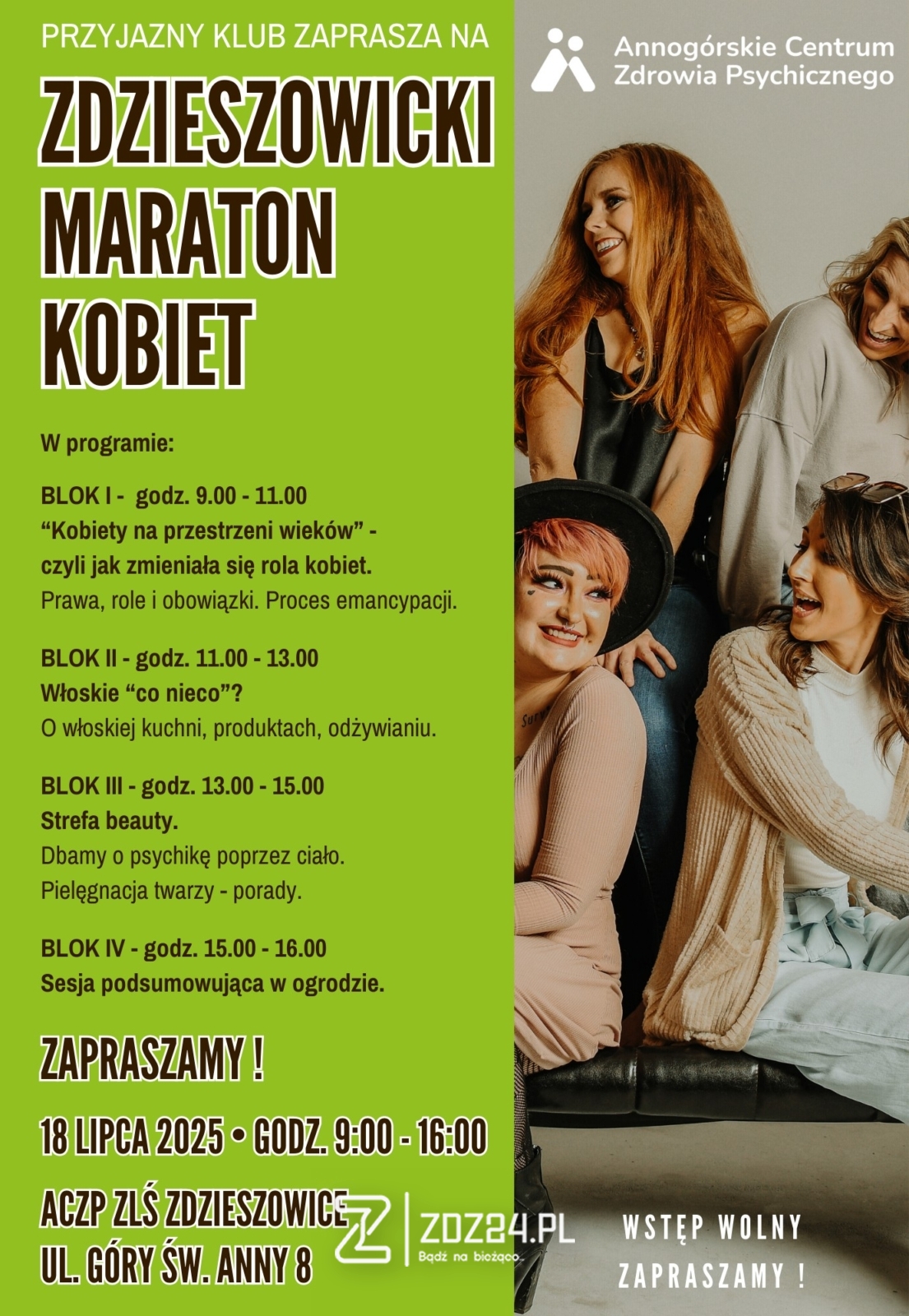 W piątek 18 lipca 2025 r. w godzinach 9:00–16:00 odbędzie się Zdzieszowicki Maraton Kobiet organizowany przez Przyjazny Klub działający przy Annogórskim Centrum Zdrowia Psychicznego. Wydarzenie kierowane jest do pełnoletnich mieszkanek miasta i gminy Zdzieszowice.