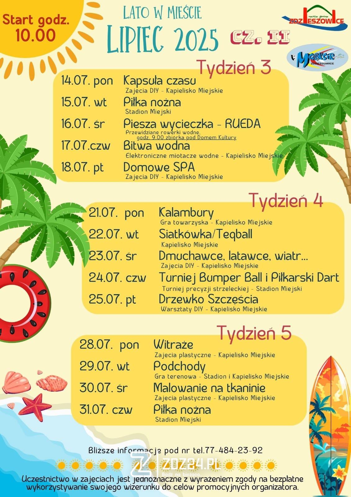 W lipcu 2025 r. na terenie Zdzieszowic odbędzie się cykl wakacyjnych zajęć pod hasłem „Lato w Mieście”. Wydarzenie potrwa 5 tygodni, a uczestnicy będą mogli codziennie (od godz. 10:00) brać udział w różnorodnych aktywnościach na Stadionie Miejskim i Kąpielisku Miejskim.
