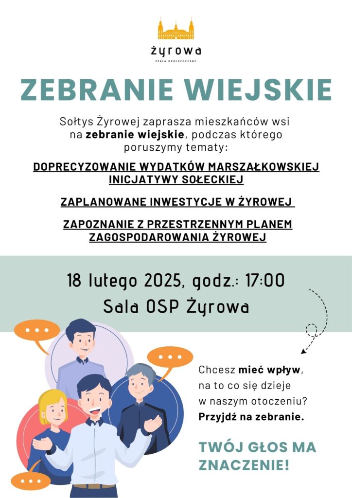 331 Sołtys Żyrowej serdecznie zaprasza wszystkich mieszkańców na wiejskie spotkanie, które odbędzie się 18 lutego 2025 r. (wtorek) o godzinie 17:00 w Sali OSP w Żyrowej. ŻyrowaZebranie Udostępnij 0 FacebookTwitterWhatsappThreadsBlueskyEmail poprzedni post Pływalnia w Zdzieszowicach ponownie otwarta następny post Walentynki w Zdzieszowicach – romantyczny seans filmowy – 14.02.2025 Może Ci się również spodobać Stwórz magię świąt razem z nami – I Jarmark Bożonarodzeniowy... 2025-10-23 Warsztaty malowania wzoru opolskiego w Zdzieszowicach 2025-10-23 Rusza XXV edycja konkursu „Poznajemy Parki Krajobrazowe Polski” 2025-10-22 Zawiadomienie o wyborach uzupełniających do Rady Sołeckiej Sołectwa Rozwadza 2025-10-22 Siatkarskie Mistrzostwa Województwa Opolskiego w Zdzieszowicach 2025-10-22 OpoLouder Festival – muzyczne święto w Pałacu w Żyrowej już... 2025-10-21 Annogórskie Centrum Zdrowia Psychicznego zaprasza do grup wsparcia w Zdzieszowicach 2025-10-21 Przeprawa promowa Walce – Zdzieszowice czasowo nieczynna 2025-10-20 II Rajd Pieszy „Setka z Sąsiadem” – jesienna edycja w Gminie... 2025-10-19 Spotkanie policjantów z seniorami w Zdzieszowicach 2025-10-19Zostaw komentarz Anuluj odpowiedźZapisz moje imię, adres e-mail i witrynę w tej przeglądarce na potrzeby kolejnych komentarzy.