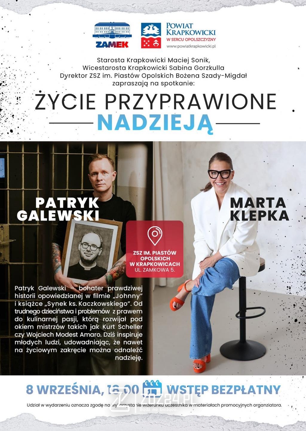 8 września 2025 roku o godzinie 18:00 w Zespole Szkół Zawodowych im. Piastów Opolskich w Krapkowicach odbędzie się spotkanie z Patrykiem Galewskim – bohaterem historii przedstawionej w filmie „Johnny” oraz książce „Synek ks. Kaczkowskiego”.